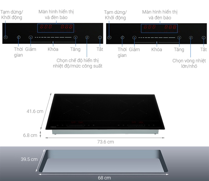 - Kích thước vùng nấu: Trái Ø 20.5 cm - Phải Ø 20.5 cm.