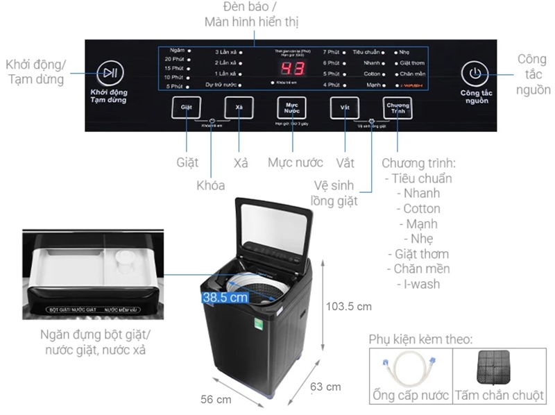 | Chăn mền. Vắt cực khô. Giặt mạnh. Giặt ngâm. Giặt nhanh. Giặt nhẹ. Giặt thơm. Giặt tiêu chuẩn. Tùy chọn. Vệ sinh lồng giặt |