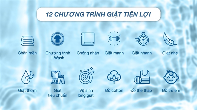 | Chăn mền, Chương trình I-Wash, Chống nhăn, Giặt mạnh, Giặt nhanh, Giặt nhẹ, Giặt thơm, Giặt tiêu chuẩn, Vệ sinh lồng giặt, Đồ cotton, Đồ thể thao, Đồ trẻ em |