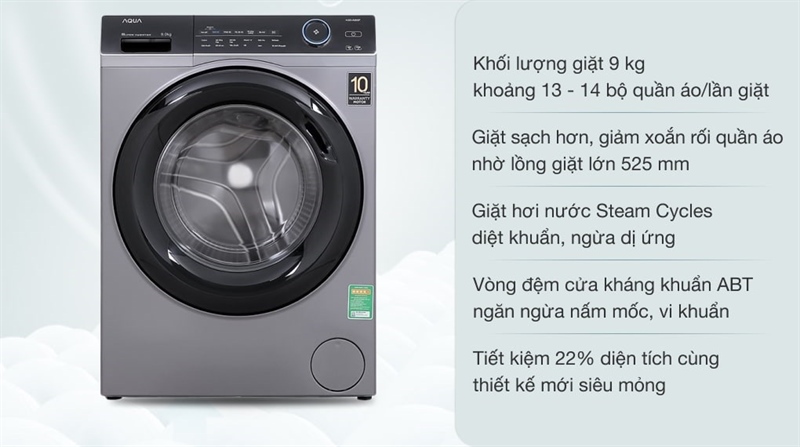 Khối lượng giặt 9 kg phù hợp với gia đình từ 3 - 5 thành viênMáy giặt Aqua Inverter 9.0 KG AQD-A900F S là lựa chọn phù hợp cho những hộ gia đình có từ 3 - 5 thành viên, hoặc ít hơn nhưng lại có nhu cầu làm sạch đồ nhiều trong mỗi lần giặt.