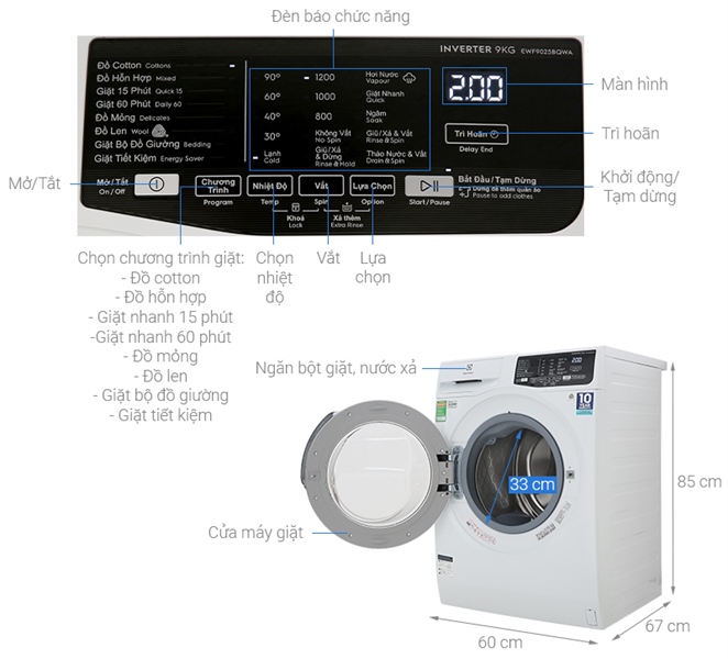 Máy giặt lồng ngang có khối lượng giặt 9kg