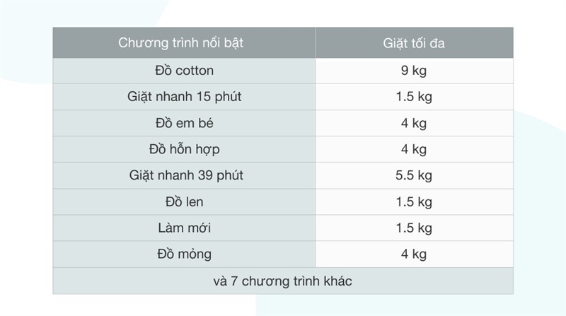 · Chương trình giặt: | Chế độ yêu thích. Giặt chăn ga. Giặt nhanh 15 phút. Giặt nhanh 39 phút. Giặt tiết kiệm. Làm mới quần áo. Làm đầy lồng giặt 60 phút. Vắt. Xả + vắt. Điều khiển bằng ứng dụng. Đồ cotton. Đồ hỗn hợp. Đồ len. Đồ mỏng. Đồ trẻ em |