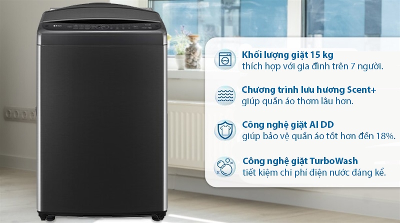 - Máy giặt LG AI DD Inverter 15 kg TV2515DV5J 2024 - Thái Lan là dạng máy giặt lồng đứng - cửa trên thiết kế sang trọng với màu đen chủ đạo giúp cho phòng giặt hay căn bếp của bạn thêm cá tính.