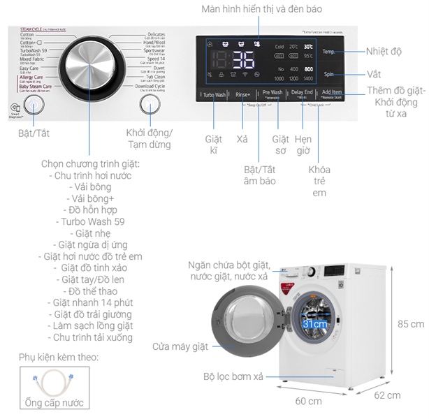 · Công nghệ giặt: | Công nghệ AI DD bảo vệ sợi vải, Công nghệ giặt hơi nước Steam (cửa trước), Công nghệ giặt tiết kiệm TurboWash, Công nghệ giặt 6 motion DD |
