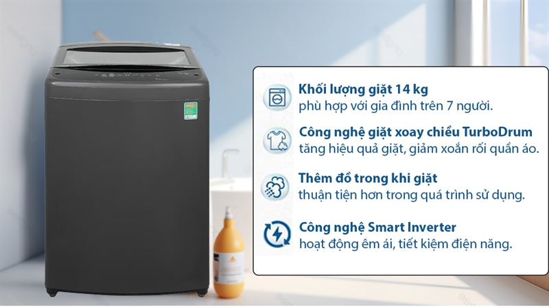 - Máy giặt LG Inverter này có khối lượng giặt 14 kg, thích hợp với gia đình có trên 7 thành viên hoặc gia đình ít thành viên hơn nhưng có nhu cầu giặt giũ hằng ngày cao.