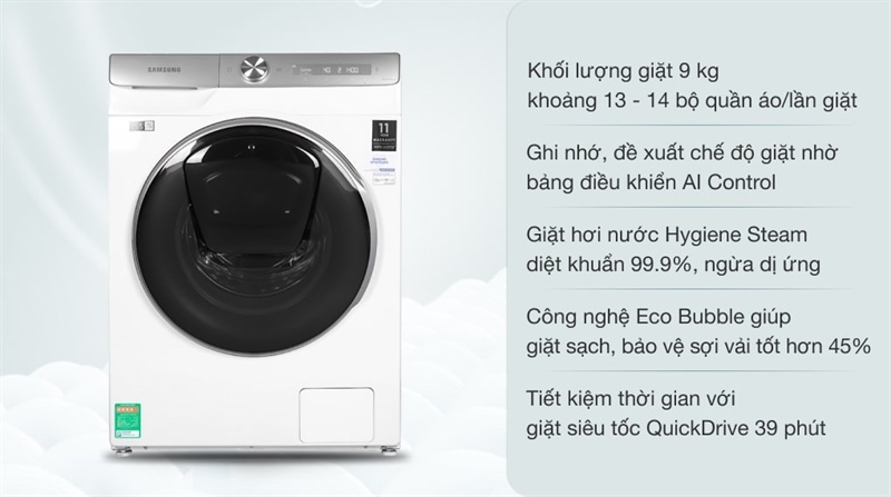 · Công nghệ giặt: | Bảng điều khiển AI control tự động ghi nhớ chế độ giặt. Công nghệ giặt bong bóng Eco Bubble. Giặt hơi nước Hygiene Steam diệt 99.9% vi khuẩn. QuickDrive giặt xả hiệu quả chỉ trong 39 phút. VRT Plus ™ giảm rung ồn đến 30% |