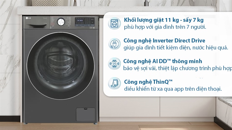 Máy giặt sấy LG Inverter giặt 11 kg - sấy 7 kg FV1411D4B với thiết kế sang trọng, tối ưu diện tích lắp đặt cho không gian, phù hợp với nhu cầu sử dụng của gia đình trên 7 thành viên. Thêm vào đó là các công nghệ giặt sấy hiện đại như công nghệ AI DD bảo vệ sợi vải, công nghệ giặt hơi nước Steam, sấy ngưng tụ,... giúp tăng hiệu quả làm sạch, ngăn ngừa dị ứng và bảo vệ làn da.