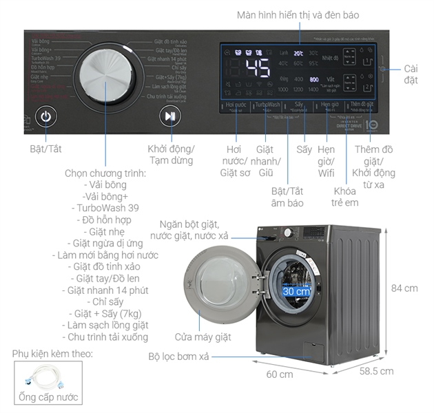 Khối lượng giặt và chương trình giặt- Máy giặt LG này có khối lượng giặt tối đa 11 kg, sấy 7 kg phù hợp với gia đình trên 7 thành viên, hoặc gia đình ít thành viên hơn nhưng nhu cầu giặt giũ cao, tiết kiệm thời gian phơi đồ.