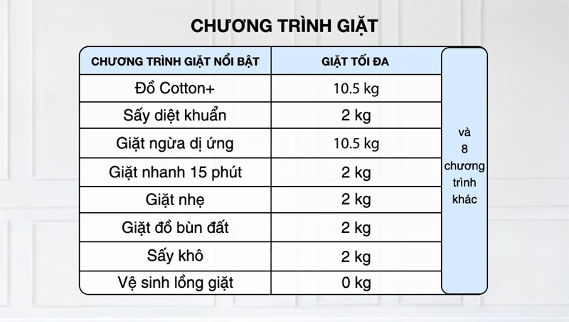 | Chăn mền. Đồ Cotton+. Sấy diệt khuẩn. Sấy khô. Giặt cổ và tay áo. Giặt hàng ngày. Giặt ngừa dị ứng. Giặt nhanh 15 phút. Giặt nhanh 38 phút. Giặt nhẹ. Giặt đồ bùn đất. Nước sốt. Sấy nhẹ. Vệ sinh lồng giặt. Đồ cotton. Đồ trẻ em |