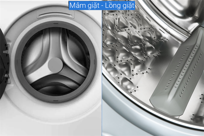- Lồng giặt làm từ thép không gỉ có độ bóng sáng, chống ăn mòn, bền bỉ, cho hiệu suất giặt đồ tốt, hạn chế vi khuẩn tích tụ và mảng bám trong máy.