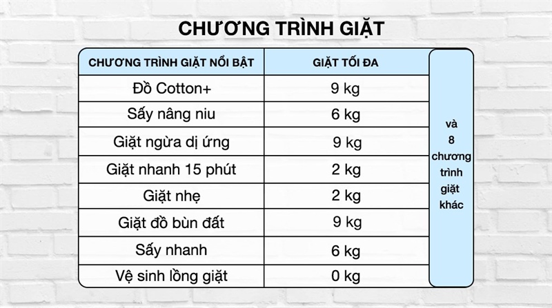 Chương trình giặt:Chăn mền. Cài đặt thời gian sấy. Sấy nâng niu. Đồ Cotton+. Giặt cổ và tay áo. Giặt hàng ngày. Giặt ngừa dị ứng. Giặt nhanh 15 phút. Giặt nhanh 38 phút. Giặt nhẹ. Giặt đồ bùn đất. Nước sốt. Sấy nhanh. Vệ sinh lồng giặt. Đồ cotton. Đồ trẻ em