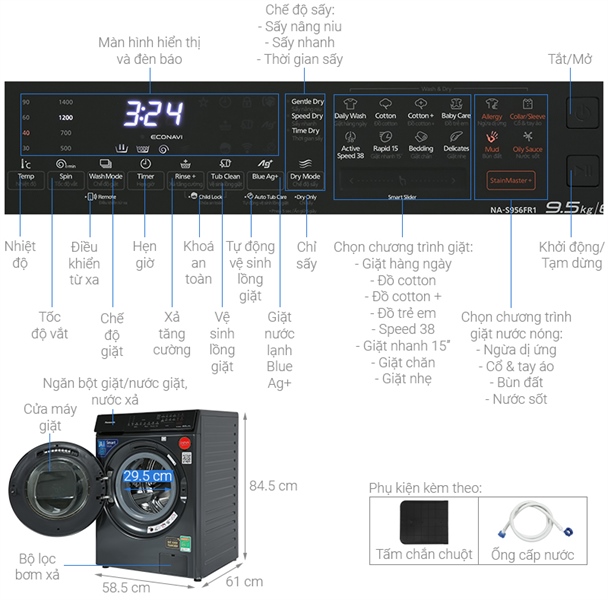 Khối lượng giặt:Giặt 9.5 Kg - Sấy 6 Kg