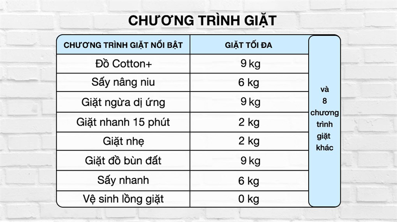 Chương trình giặt:Chăn mền. Cài đặt thời gian sấy. Sấy nâng niu. Đồ Cotton+. Giặt cổ và tay áo. Giặt hàng ngày. Giặt ngừa dị ứng. Giặt nhanh 15 phút. Giặt nhanh 38 phút. Giặt nhẹ. Giặt đồ bùn đất. Nước sốt. Sấy nhanh. Vệ sinh lồng giặt. Đồ cotton. Đồ trẻ em