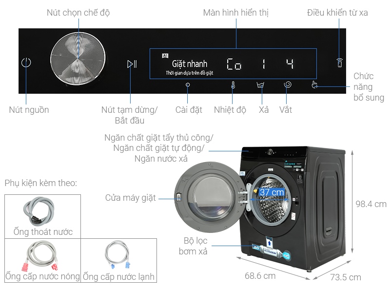 Giặt thông minh, kết nối và điều khiển từ xa với ứng dụng SmartThingsBảng điều khiển AI Control còn có nhiều tiện ích ưu việt mà Samsung đã mang đến để phục vụ người dùng như: kết nối với điện thoại thông minh qua SmartThings, hiển thị mã lỗi thông minh, điều chỉnh thông số dễ dàng, tùy chọn hiển thị chương trình giặt mang đến sự tiện nghi cho gia đình bạn.