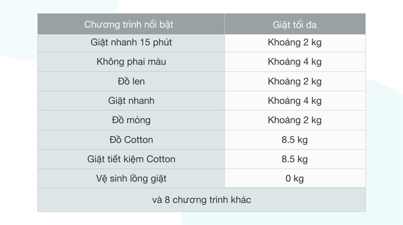 | Ghi nhớ chương trình giặt. Giặt chăn ga. Giặt không phai màu. Giặt nhanh. Giặt nhanh 15 phút. Giặt tiết kiệm Cotton. Vắt. Vệ sinh lồng giặt. Xả + vắt. Áo khoác dày. Đồ cotton. Đồ hỗn hợp. Đồ len. Đồ mỏng. Đồ thể thao. Đồ trẻ em |
