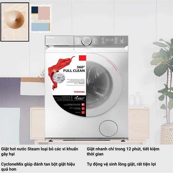 Máy giặt Toshiba trang bị 360 FULL CLEAN gồm 3 công nghệ đỉnh cao. Trong đó công nghệ AI có khả năng cảm biến thông minh cho ra chương trình giặt tối ưu, công nghệ CycloneMix giúp đánh tan xà phòng tốt hơn, không gặp tình trạng đọng xà phòng trên quần áo; công nghệ Ultra Fine Bubble tạo ra các siêu bọt khí nano, giặt sạch sâu từng sợi vải.
