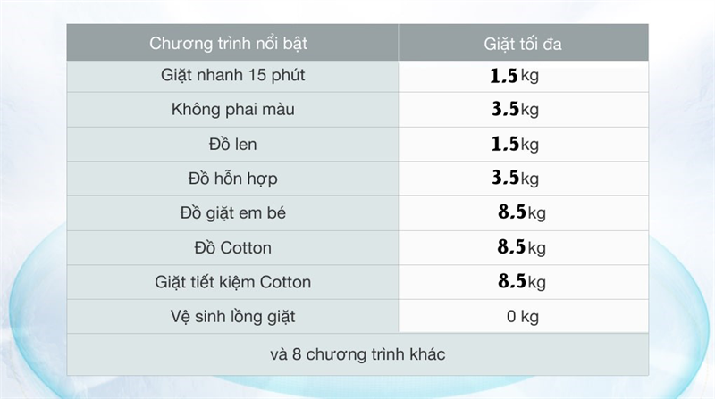 | Đồ Cotton, Đồ Cotton - Giặt tiết kiệm, Đồ hỗn hợp, Đồ mỏng, Đồ em bé, Đồ thể thao, Đồ len, Sợi tổng hợp, Áo khoác dày, Khăn trải giường, Giặt nhanh 15 phút, Không phai màu, Chỉ vắt, Xả và vắt, Vệ sinh lồng giặt, Chương trình đã nhớ |