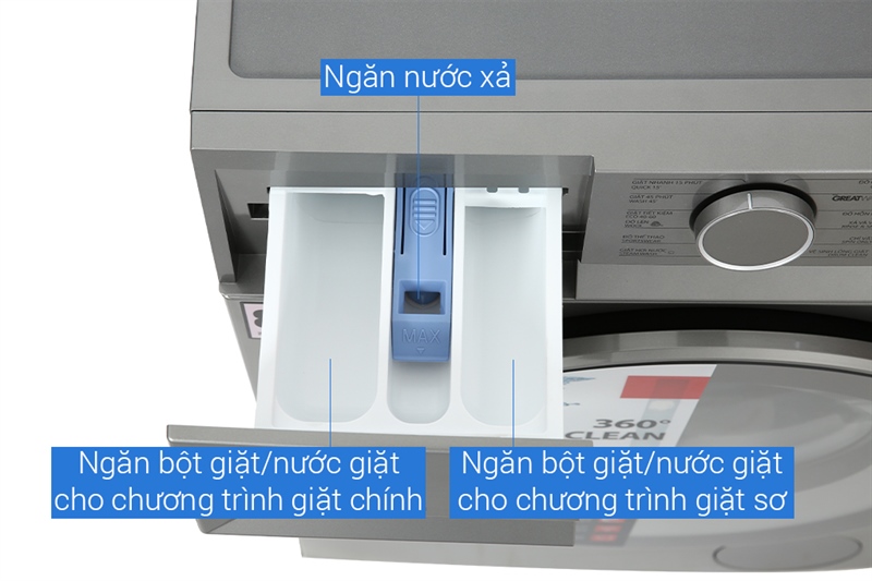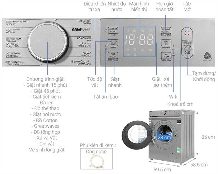 · Chương trình giặt: | Chỉ vắt, Giặt 45 phút, Giặt hơi nước, Giặt nhanh 15 phút, Giặt siêu sóng Greatwaves, Giặt tiết kiệm, Vệ sinh lồng giặt, Xả + vắt, Đồ cotton, Đồ hỗn hợp, Đồ len, Đồ thể thao |