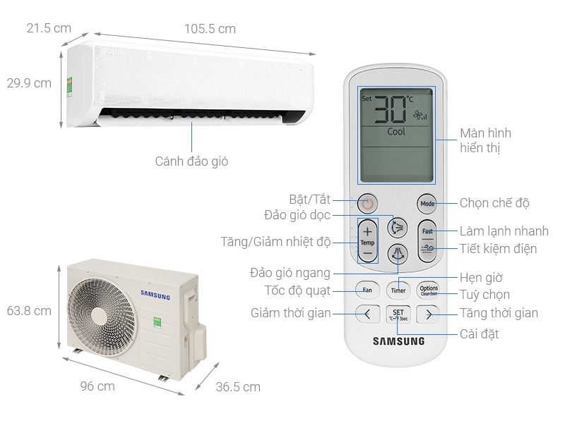 • Kích thước dàn lạnh: Dài 105.5 cm - Cao 29.9 cm - Dày 21.5 cm