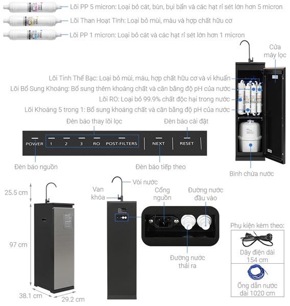 - Lõi RO (Sx Hàn Quốc): Loại bỏ 99.9% chất độc hại trong nước.