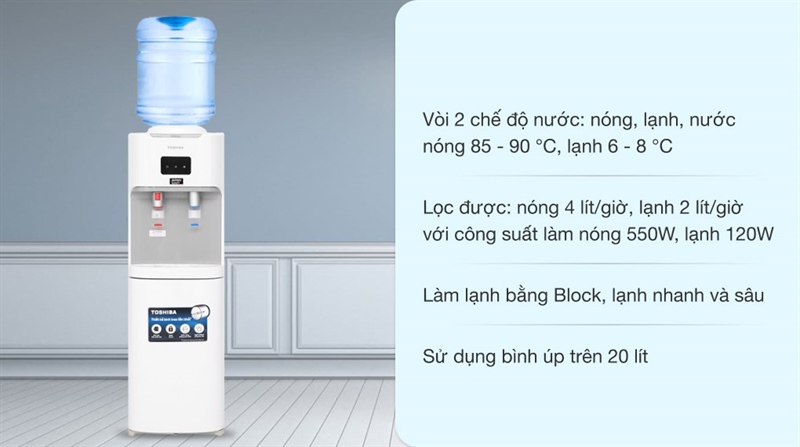 Lượng nước làm nóng đạt 4 lít/h, lượng nước làm lạnh đạt 2 lít/h, công suất làm nóng 550 W, làm lạnh 120 W cho lượng nước nóng, lạnh dồi dào đáp ứng nhu cầu uống nước mát giải nhiệt, pha trà, chế mì, pha sữa... của mọi người dùng.