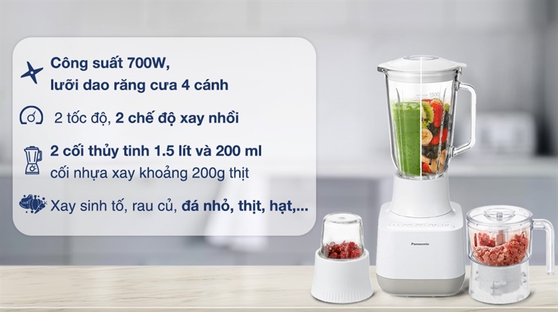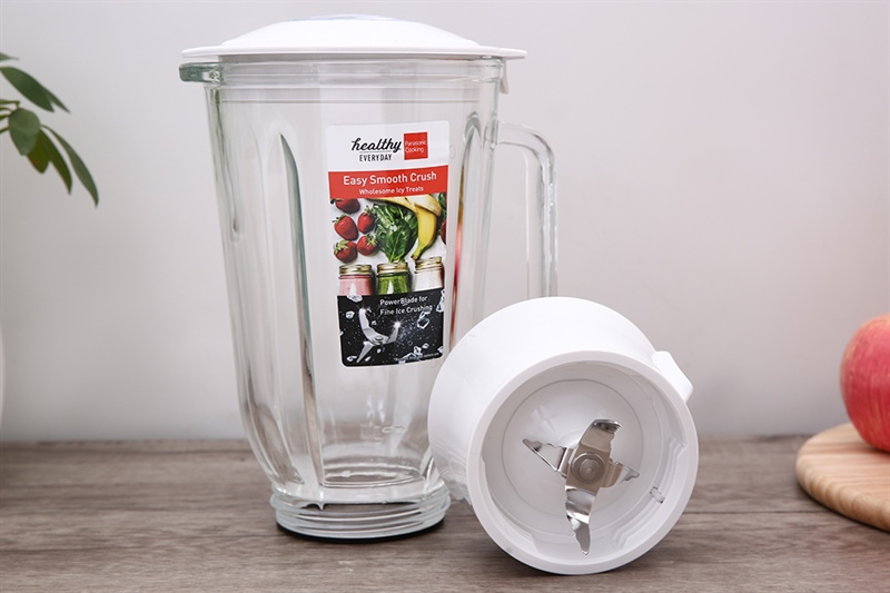 Máy xay sinh tố Panasonic thiết kế màu trắng sang trọng, công suất 700W, lưỡi dao sắc bén, cùng công nghệ đảo trộn V&M, cho bạn những ly sinh tố thơm ngon, bổ dưỡng hay chế biến những bữa ăn đa dạng từ thịt và cá.