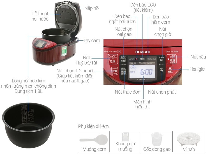 Thông số kỹ thuật Nồi cơm điện cao tần Hitachi 1.8 lít RZ-KV180YS
