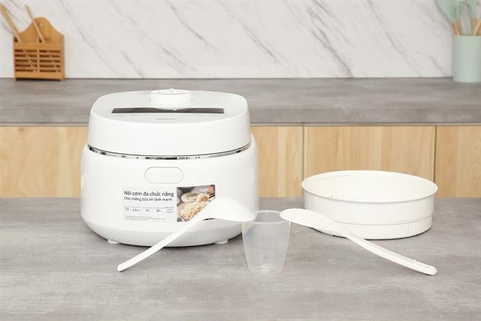 - Bộ phụ kiện đầy đủ bao gồm xửng hấp, muỗng cơm, muỗng canh và cốc đong.