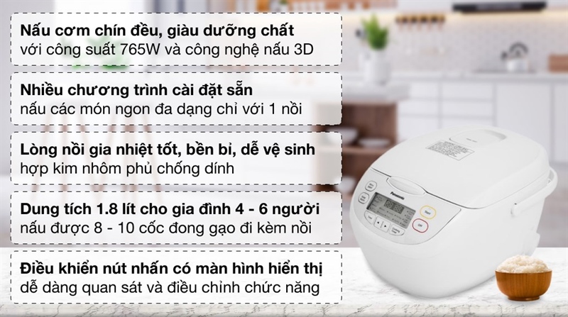 Nồi cơm điện Panasonic này có dung tích 1.8 lít phục vụ cho gia đình 4 – 6 người