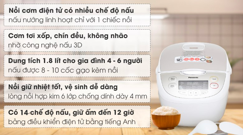 Nồi cơm điện tử Panasonic 1.8 lít SR-CP188NRA 2019 - Malaysia thương hiệu Nhật Bản, nhiều chức năng nấu tiện dụng, được nhiều người tin dùng.