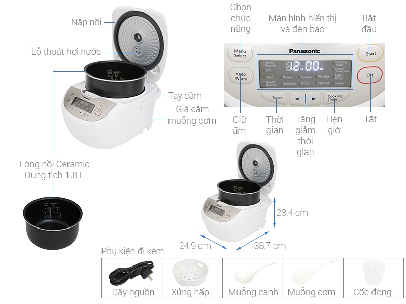 | Có xửng hấp. Van thoát hơi thông minh. Hẹn giờ 24 tiếng. Giữ ấm 12 tiếng |