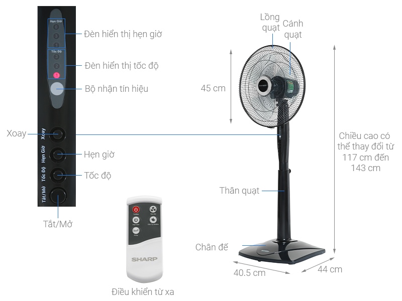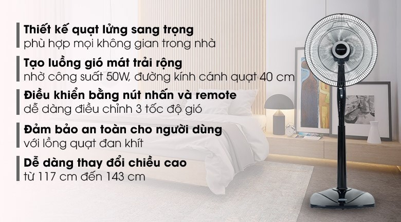 · Tiện ích | Có remote Hẹn giờ tắt Điều chỉnh được chiều cao Lồng quạt có khe hở nan quạt nhỏ Tự ngắt khi quá nhiệt |