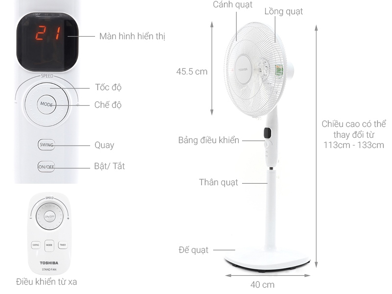 | Có remote. Hẹn giờ tắt. DC Inverter tiết kiệm điện. Điều chỉnh được chiều cao. Lồng quạt có khe hở nan quạt nhỏ. Màn hình LED hiển thị |