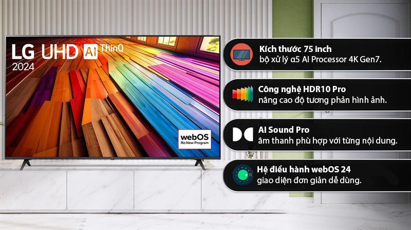 Kích thước siêu lớn của Smart Tivi LG 4K 75 inch 75UT8050PSB 2024 - INDONESIA khiến cho sản phẩm này mang đến trải nghiệm xem phim và chơi game tuyệt vời chưa từng có cho bất kì gia đình nào. Chiếc tivi này có bộ xử lý α5 AI Processor 4K Gen7, công nghệ nâng cấp độ phân giải hình ảnh 4K AI Upscaling, công nghệ âm thanh AI Sound Pro, hệ điều hành webOS 24 tích hợp kho ứng dụng giải trí phong phú.