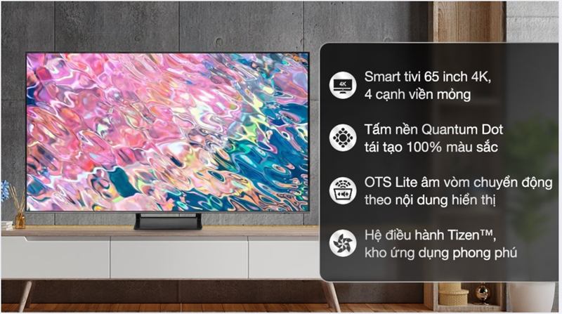 Tóm lại, Smart Tivi QLED 4K 65 inch Samsung QA65Q60B đang sở hữu rất nhiều điểm mạnh từ thiết kế hiện đại, công nghệ hình ảnh Quantum Dot, Quantum HDR, bộ xử lý Quantum 4K Lite, công nghệ âm thanh OTS Lite tái tạo nội dung chân thật với từng thể loại, hệ điều hành thân thiện với người dùng, chiếu màn hình, điều khiển tivi tiện lợi, thật xứng đáng để hiện diện trong ngôi nhà của bạn.
