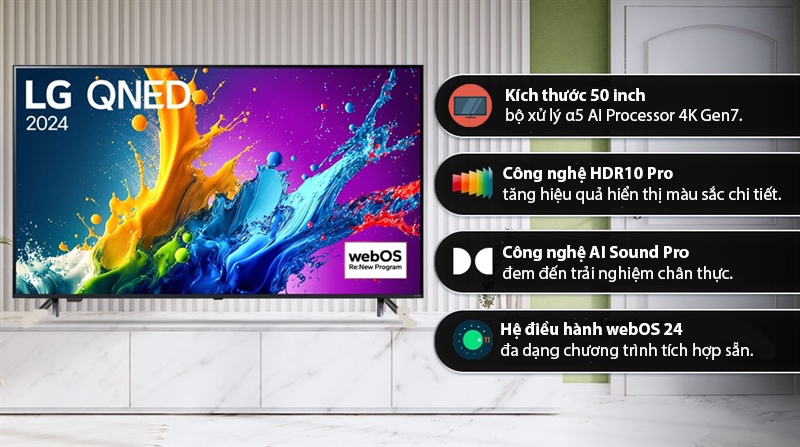 Smart Tivi QNED LG 4K 50 inch 50QNED80TSA 2024 - INDONESIA cung cấp khung hình rõ nét chất lượng 4K nhờ tích hợp bộ xử lý α5 AI Processor 4K Gen7, công nghệ QNED Color cho màu sắc phong phú, ấn tượng, công nghệ âm thanh AI Sound Pro tương thích với từng nội dung, dễ dàng tìm kiếm bằng giọng nói hỗ trợ tiếng Việt với Magic Remote có tích hợp micro.