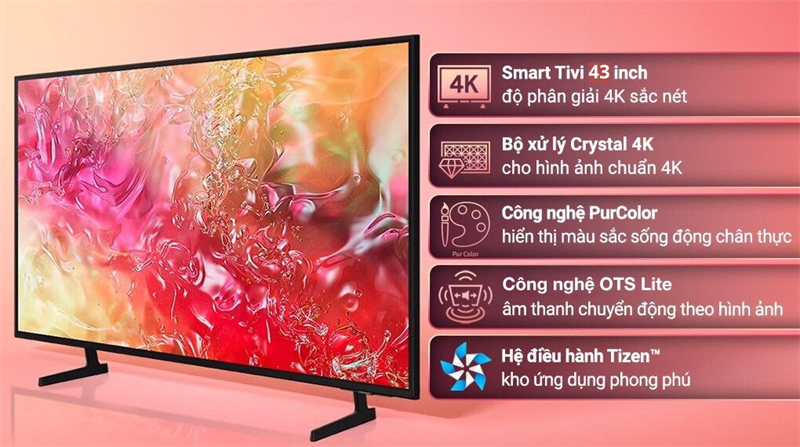 - Bộ xử lý Crystal 4K tối ưu màu sắc và tỷ lệ tương phản, giúp hình ảnh trở nên chân thực và rõ nét hơn.