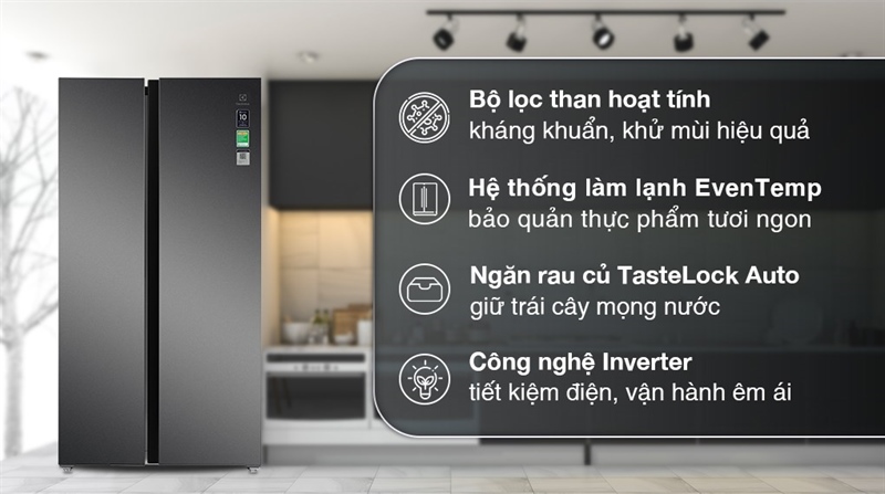 Tủ lạnh Electrolux Inverter 624 Lít ESE6600A-AVN 2022 thiết kế Side by side thời thượng, dùng tiết kiệm điện với công nghệ Inverter, công nghệ làm lạnh EvenTemp làm lạnh riêng biệt từng ngăn giúp thực phẩm giữ lạnh đều, hiệu quả, ngăn rau củ TasteLock Auto giúp rau củ quả của bạn luôn tươi xanh, hấp dẫn, tích hợp bộ lọc than hoạt tính khử mùi mạnh mẽ, dung tích sử dụng lớn 624 lít lựa chọn dành cho gia đình trên 5 người.