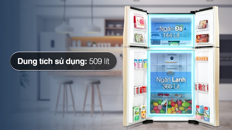 – Dung tích sử dụng lên đến 509 lít, thích hợp sử dụng cho gia đình có từ 4 – 5 thành viên hoặc gia đình có ít người hơn nhưng nhu cầu lưu trữ nhiều thực phẩm.