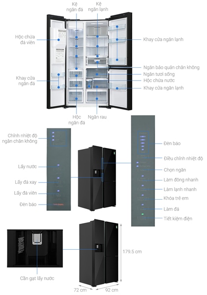 Tiện ích | Bảng điều khiển màn hình LED. Chế độ cấp đông nhanh. Có khóa. Làm lạnh nhanh. Đệm cửa chống mốc. Làm đá tự động. Lấy nước bên ngoài. Chuông báo khi quên đóng cửa. Lấy đá bên ngoài |