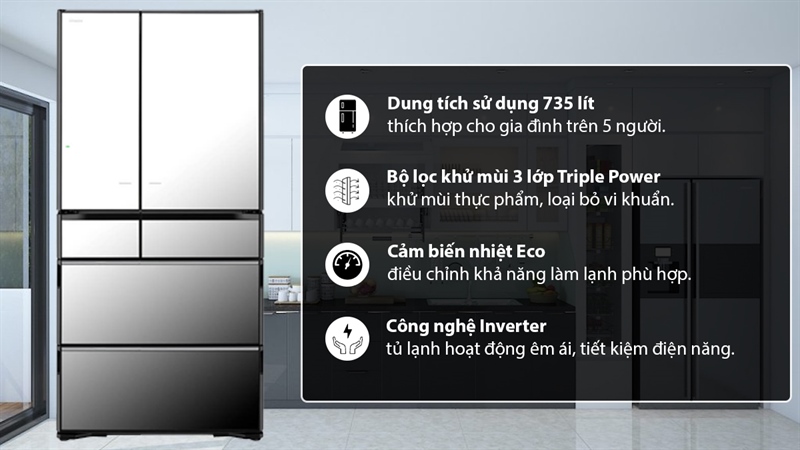 - Hitachi Inverter 735 lít R-ZX740KV X được thiết kế kiểu dạng tủ lạnh Multi Door 6 cánh hiện đại và độc đáo với chất liệu cửa tủ bằng mặt gương sáng bóng, tạo nên điểm nhấn tại bất kỳ vị trí nào trong khu vực nhà bếp.