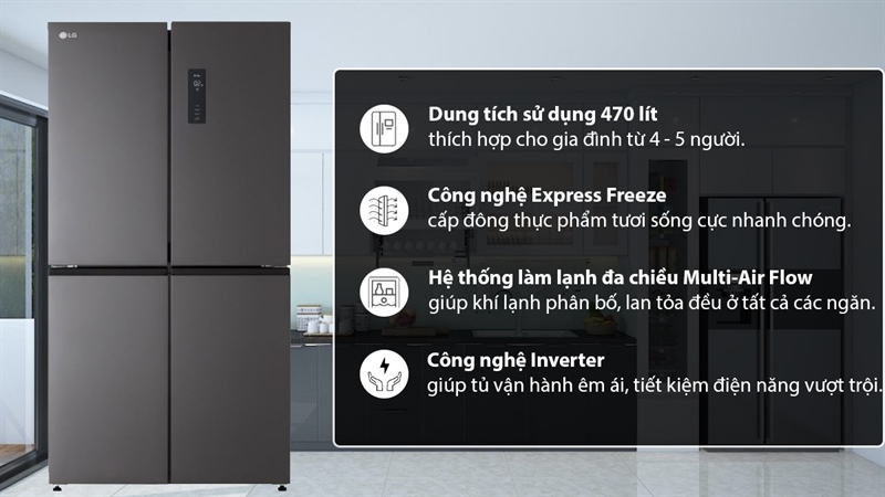 - Hệ thống làm lạnh đa chiều Multi-Air Flow, luồng khí lạnh sẽ được thổi ra từ nhiều cửa thoát hơi lạnh hơn, giúp cho khí lạnh phân bố, lan tỏa đều ở tất cả các ngăn bên trong tủ lạnh giúp thực phẩm giữ được sự tươi ngon.