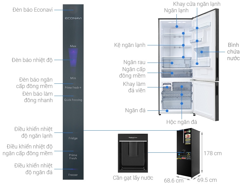 · Kích thước tủ lạnh: | Cao 178 cm - Rộng 68.6 cm - Sâu 69.5 cm - Nặng 68 kg |