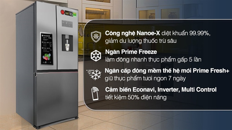 • Công nghệ bảo quản thực phẩm: Ngăn cấp đông nhanh gấp 5 lần Prime Freeze, Ngăn đông mềm Prime Fresh -3 độ C, Ngăn rau củ Fresh Safe