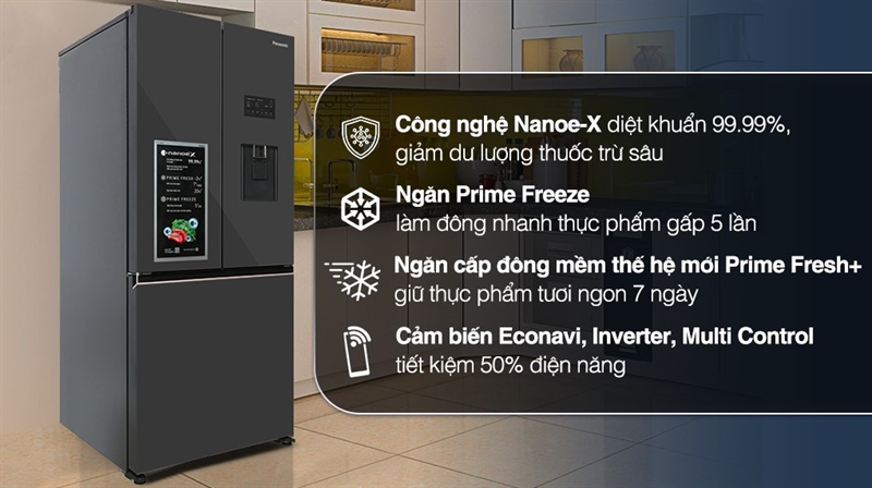 • Công nghệ bảo quản thực phẩm: Ngăn cấp đông nhanh gấp 5 lần Prime Freeze, Ngăn đông mềm Prime Fresh -3 độ C, Ngăn rau củ Fresh Safe