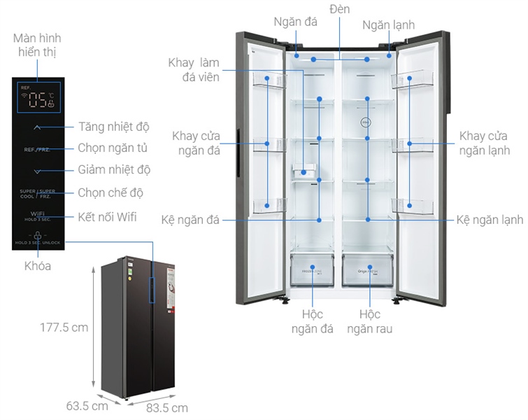 · Kích thước tủ lạnh: | Cao 177.5 cm - Rộng 83.5 cm - Sâu 63.5 cm - Nặng 76 kg |
