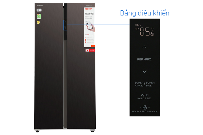 Bảng điều khiển điện tử được bố trí bên ngoài tủ lạnh Toshiba Inverter, nằm trên tay cầm phía trên của ngăn mát, giúp người dùng dễ quan sát và điều khiển thuận tiện.