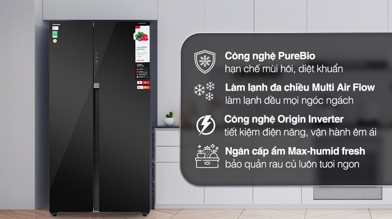Với chiếc tủ lạnh Toshiba Inverter này bạn có thể cân nhắc nếu đang sở hữu một không gian có diện tích tương đối rộng. Đồng thời với nhiều tính năng đảm bảo nhu cầu bảo quản thực phẩm như khử mùi, diệt khuẩn với công nghệ PureBio, luồng khí lạnh đa chiều Multi Air Flow, hợp kim Alloy cooling làm lạnh nhanh, ngăn cấp ẩm Max-humid fresh, công nghệ Origin Inverter tiết kiệm điện.