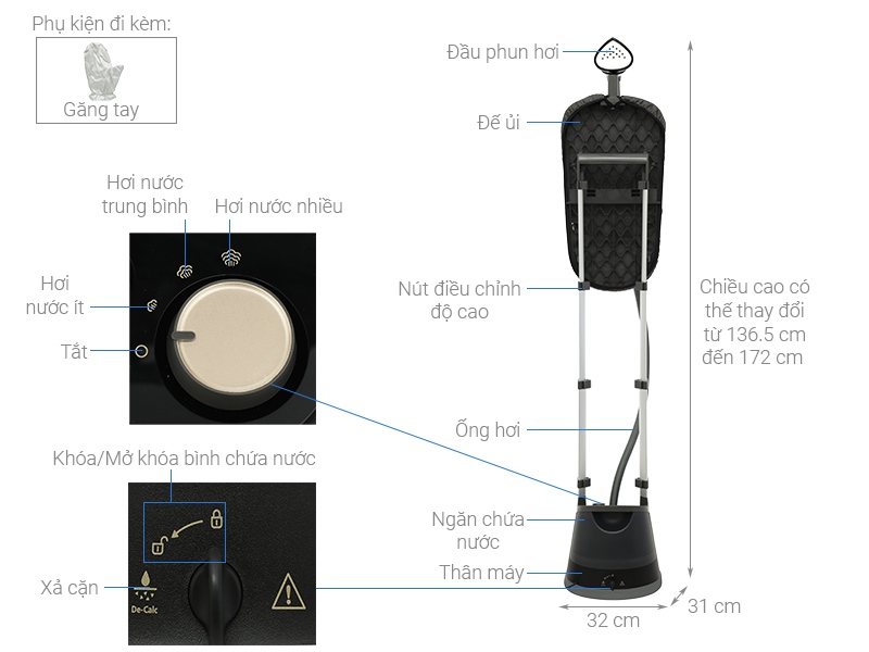 · Tiện ích: | Chế độ xả cặn Ủi quần áo treo Diệt khuẩn và loại bỏ mùi hôi Nắp chứa tinh dầu Điều chỉnh được chiều cao Không tạo vết cháy |