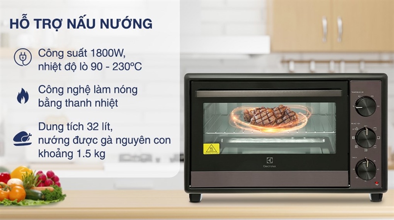 - Dung tích 32 lít, có thể nướng được gà nguyên con khoảng 1.5 kg.